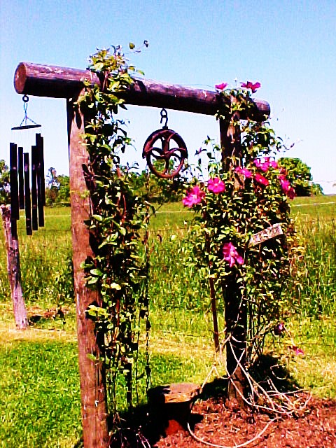 We have two Clematis growing up this old well post. The purple one hasn't bloomed yet. The birds love to sit up there and sing, and we love it.